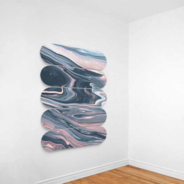 This set of 5 high-quality 7-ply 100% maple skateboards are the perfect statement piece for any home or office. Custom printed graphics, one-of-a-kind art piece.